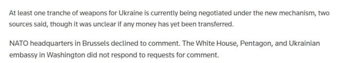 报道中的两名消息人士表示,目前至少有一批援乌武器已按新机制进入采购谈判阶段,尚不清楚是否划转资金。按路透社说法,北约总部对此事未发表评论。美国白宫、五角大楼以及乌克兰驻美国使馆均未作出回应。